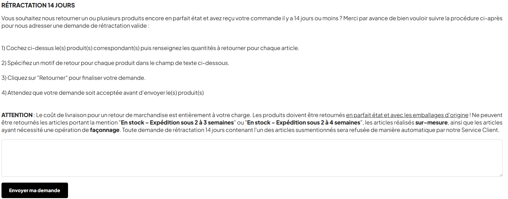 Délai : Vous avez jusqu'à 14 jours après la réception de votre commande pour initier une demande de rétractation.
